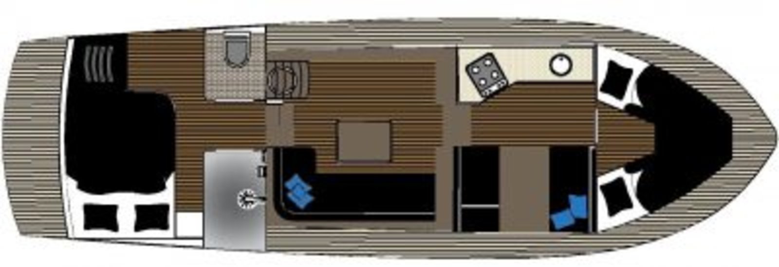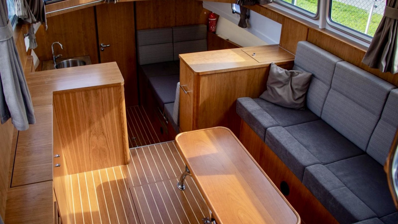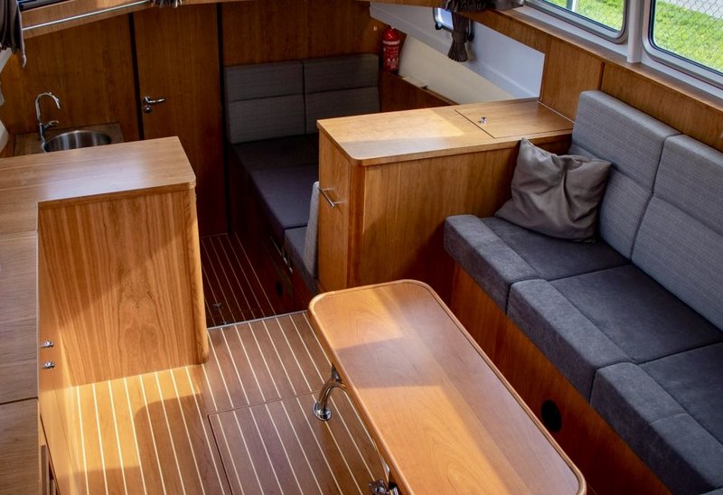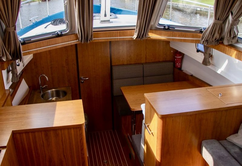 An Bord gibt es Platz für 4 bis 6 Personen. Der Innenraum ist hell und großzügig gestaltet, mit einem komfortablen Salon und guter Rundumsicht. Im Bug befindet sich eine geräumige Kabine mit Doppelbett. Im Heck liegt eine zweite Kabine, wodurch das Schiff ideal für mehrere Personen geeignet ist.