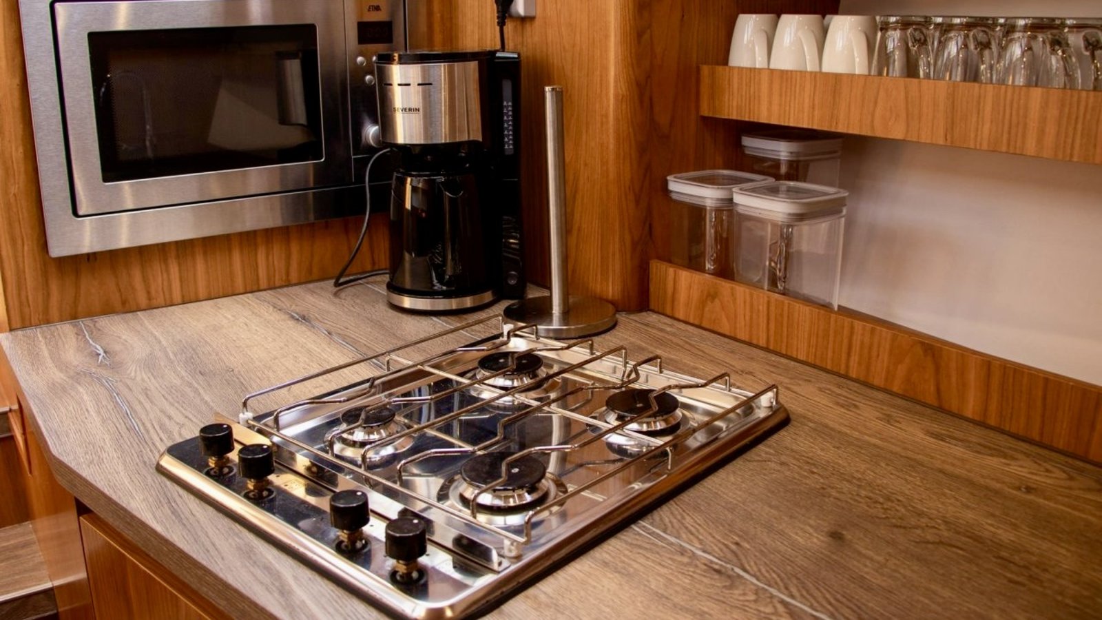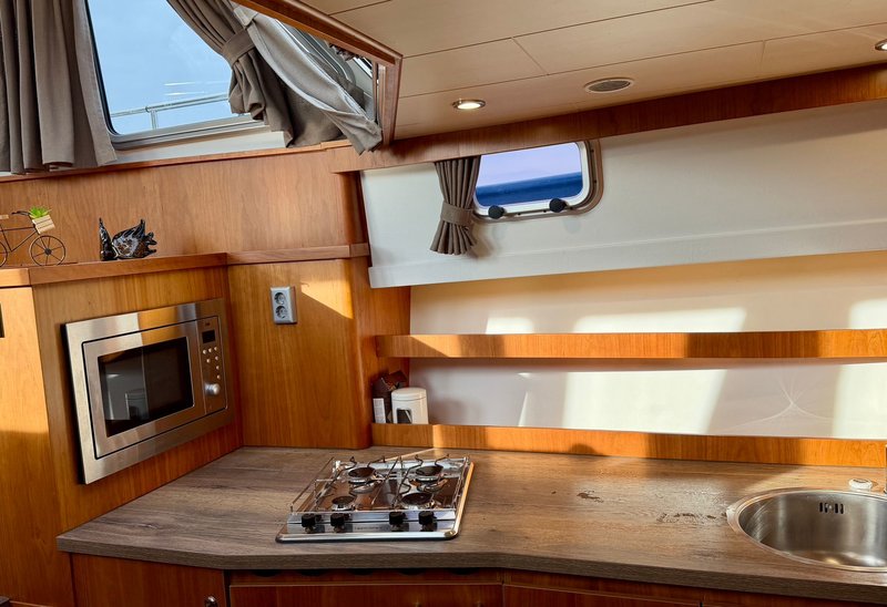 Die Küche ist praktisch eingerichtet und für den täglichen Gebrauch während des Bootsurlaubs bestens geeignet. Das Badezimmer verfügt über Toilette, Waschbecken und Dusche. Warmwasser und Heizung sorgen auch bei kühlerem Wetter für angenehmen Komfort an Bord.