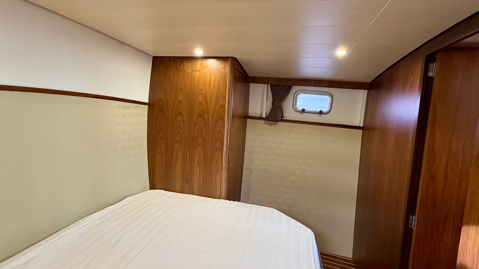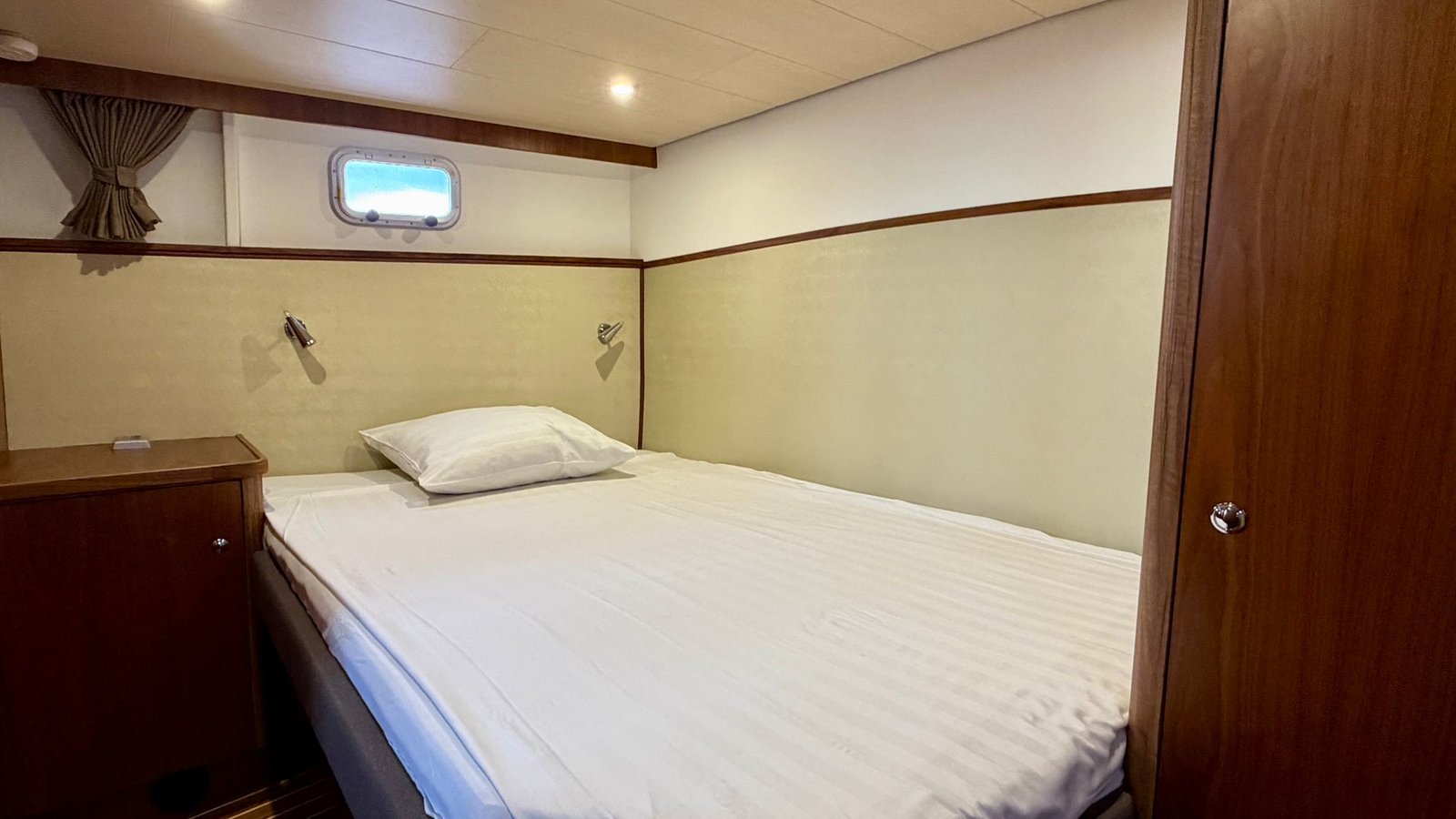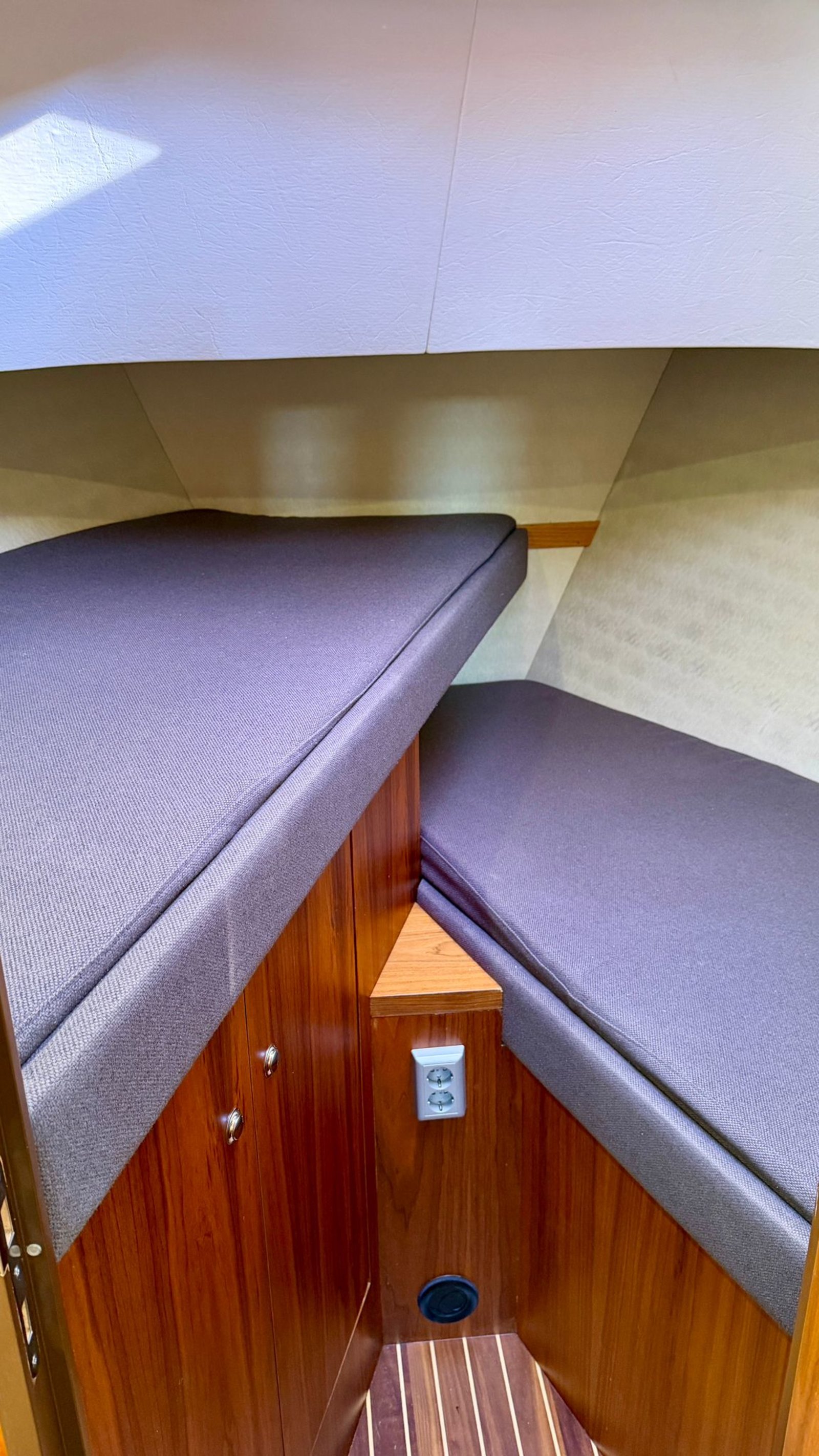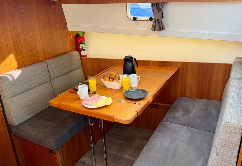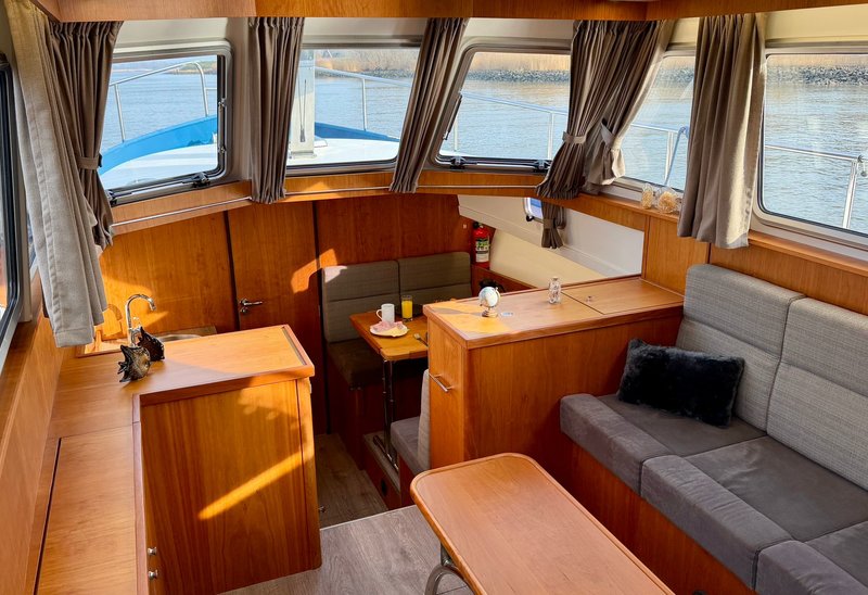An Bord gibt es Platz für 4 bis 6 Personen. Der Innenraum ist hell und großzügig gestaltet, mit einem komfortablen Salon und guter Rundumsicht. Im Bug befindet sich eine geräumige Kabine mit Doppelbett. Im Heck liegt eine zweite Kabine, wodurch das Schiff ideal für mehrere Personen geeignet ist.